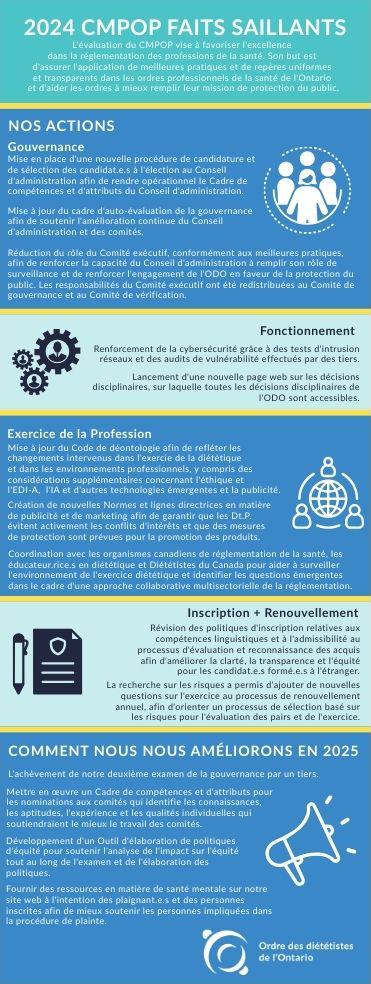 C’est la question à laquelle le ministère de la Santé de l’Ontario a demandé aux organismes de réglementation des professions de la santé de répondre lorsqu’il a mis au point le Cadre de mesure de la performance des ordres professionnels (CMPOP), son outil de présentation des rapports. Cet outil a été élaboré par le Ministère, en collaboration avec les ordres professionnels de la santé de l’Ontario, des experts en la matière et le public.